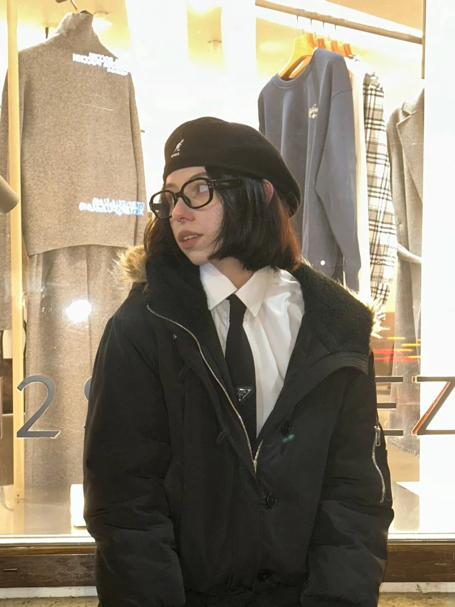 I saw you by the shop window, you were just standing there and looking off to the side, like you were lost in your own thoughts. The light from the store fell in such a way that everything looked really cozy, and I wanted to capture it. I told you not to move — and then, click.